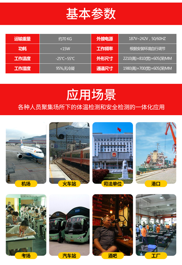 产品用途: 1 机场、海关、港口、车站等需要检测体温场所的安全检查。 2 法院、公安、监狱、看守所的违禁金属物品的安全检查。 3 重要场所、展览馆、展销会、商贸活动集会、庆典会、体育场等重要公共场所的入口检查。