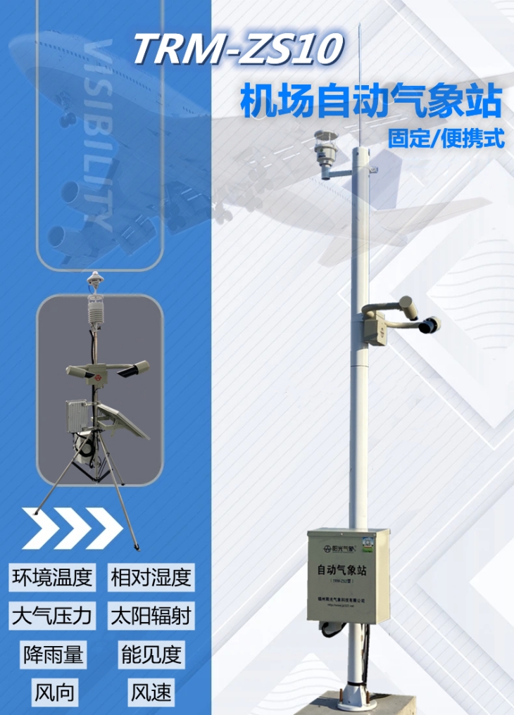 常规机场气象站分为固定式和便携式两种观测方式,固定式常选用分 体结构,立杆高度通常为 6-10 米;而便携式常选用一体化结构,小巧重量轻便,随测随走,可快速部署到机场的不同领域,实现全方位无死角监测。