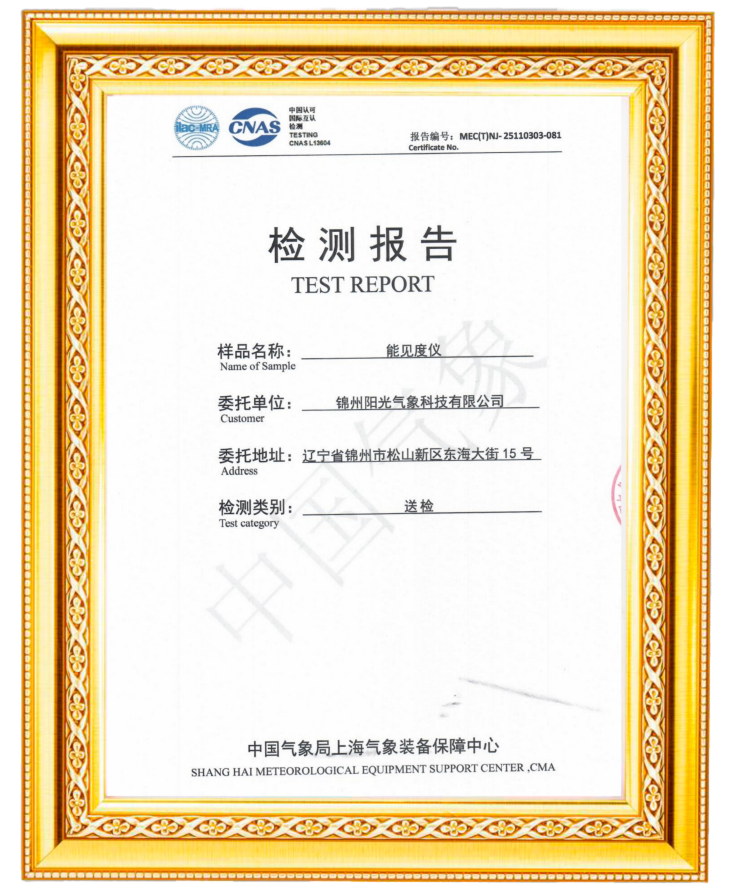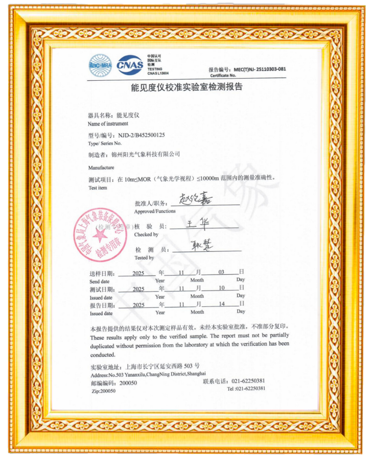 阳光气象NJD-2型能见度仪通过中国气象局上海气象装备保障中心检测,此次能见度仪送检工作的顺利完成,不仅是对阳光气象专业水平的权威盖章,更标志着品牌在气象装备领域的综合实力获得国家级认可。为今后产品研发奠定良好基础,同时阳光气象也将持续使用全面精准的气象数据为客户提供专业气象服务。