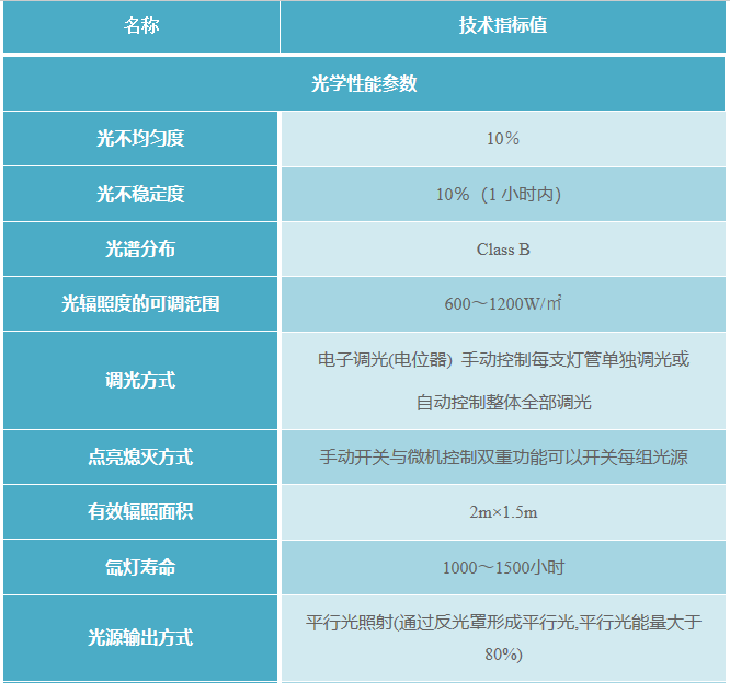 1.选用超高气压线形长弧氙灯做光源。其共性是发光体尺寸小,呈线状,亮度高,容易被光学系统处理成便于使用的平行光源。氙灯的光谱是从紫外、可见到红外的连续光谱,在可见区与太阳光谱极其相似,并且辐射光强度可调。