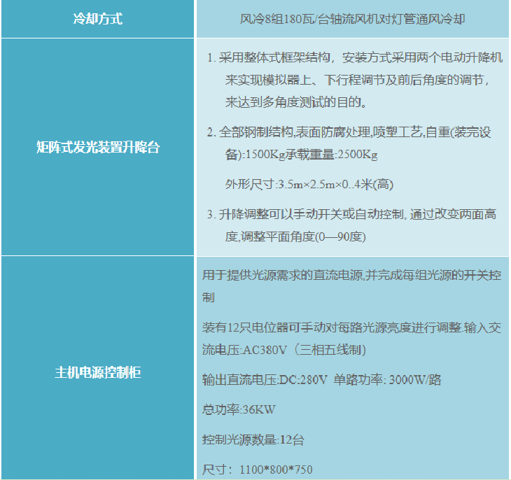 4.装有四组大功率风机,对发射光源环境进行强制冷却,可对太阳能热水器、集热器、电池板、太阳能发电站等产品进行直接照射。