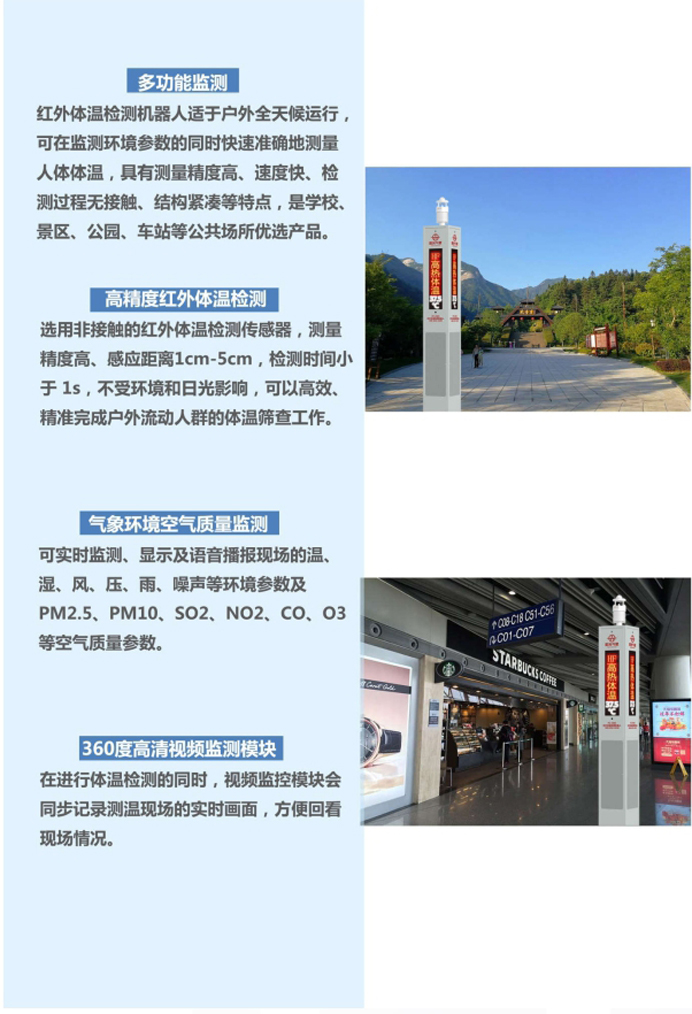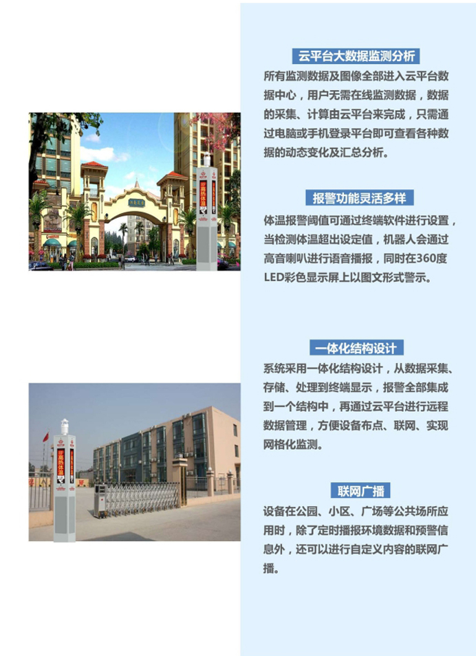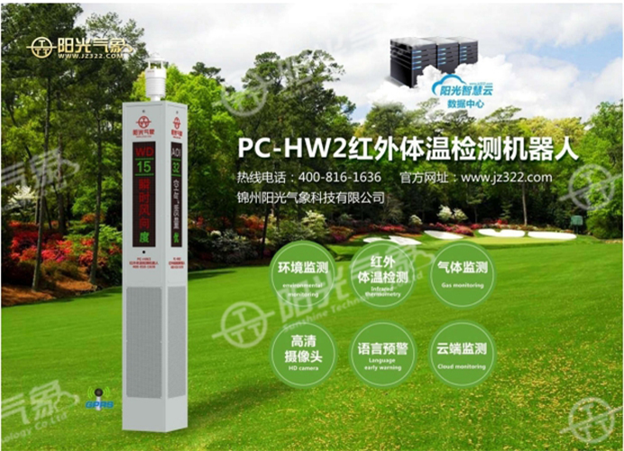 PC-HW2 红外体温检测机器人,是锦州阳光气象旗下的一款智能红外体温检测机器人产品, 是集红外体温检测、气象环境监测、空气质量预警、语音播报、LED 彩屏显示等功能于一体的智能平台型红外体温检测机器人。实现了物联网云端监测,是基于大数据软件技术和智能传感器硬件技术研发出的新一代高科技产品。