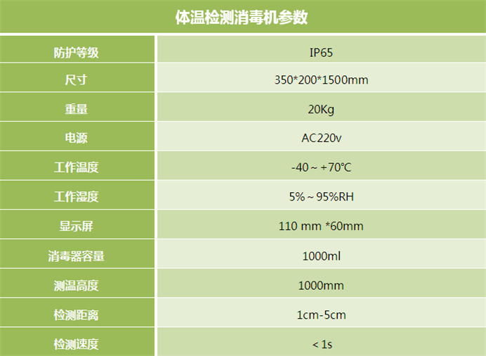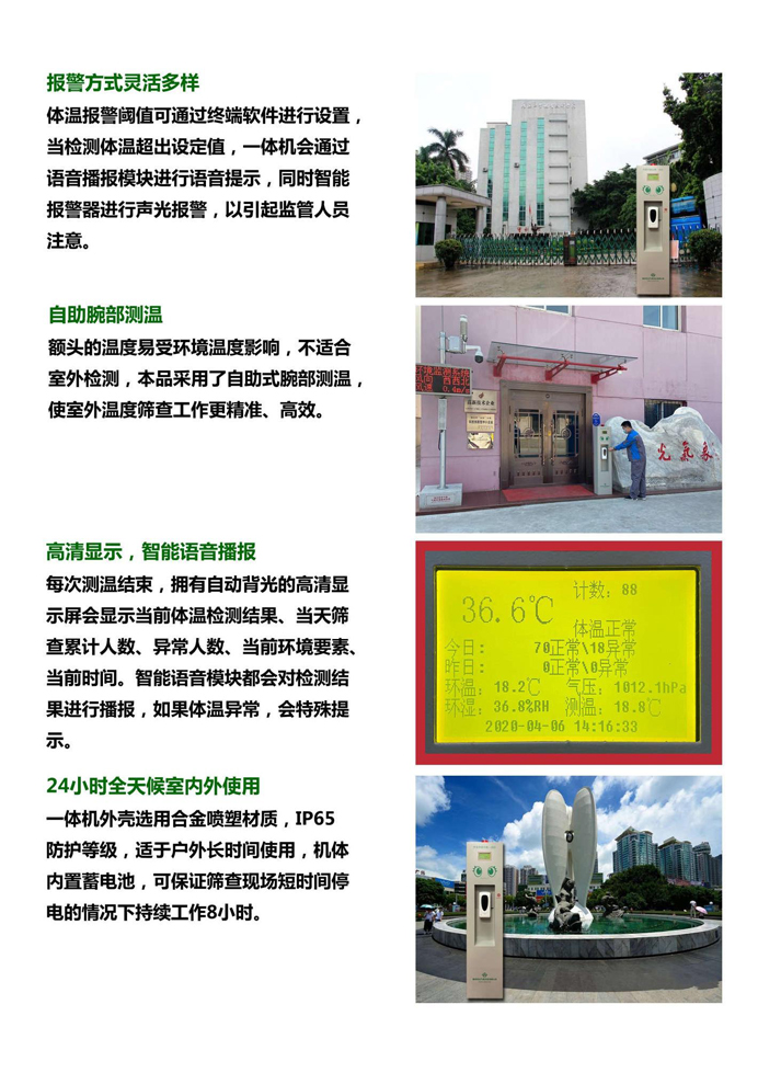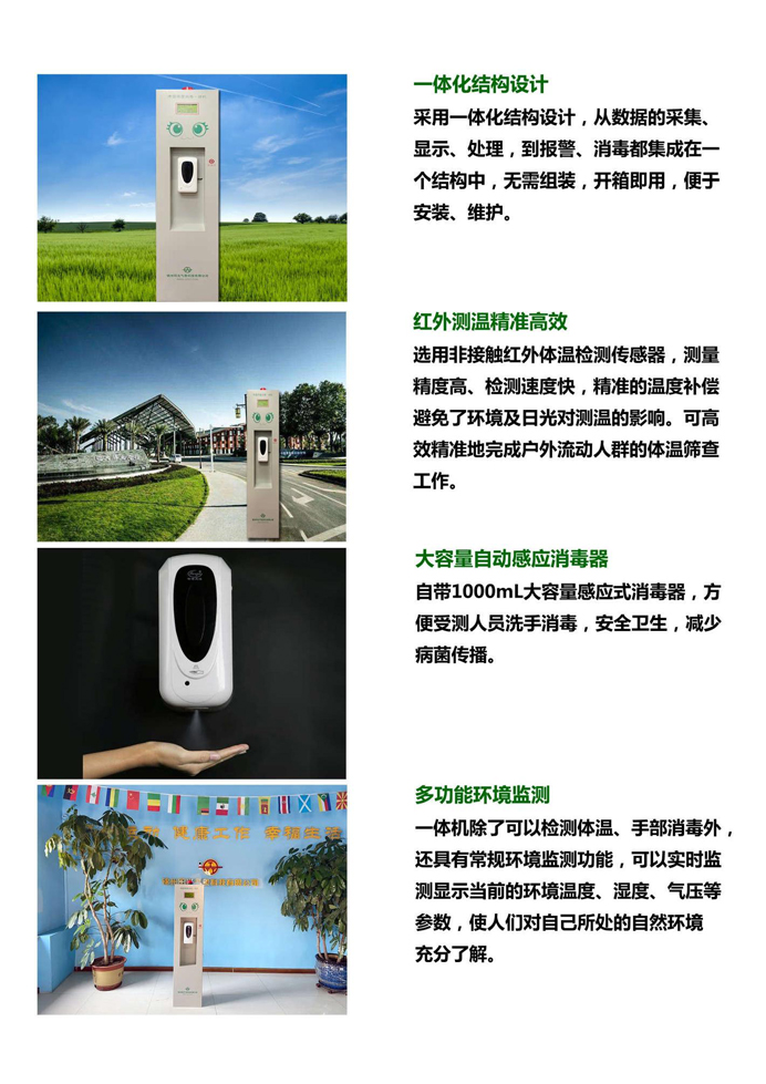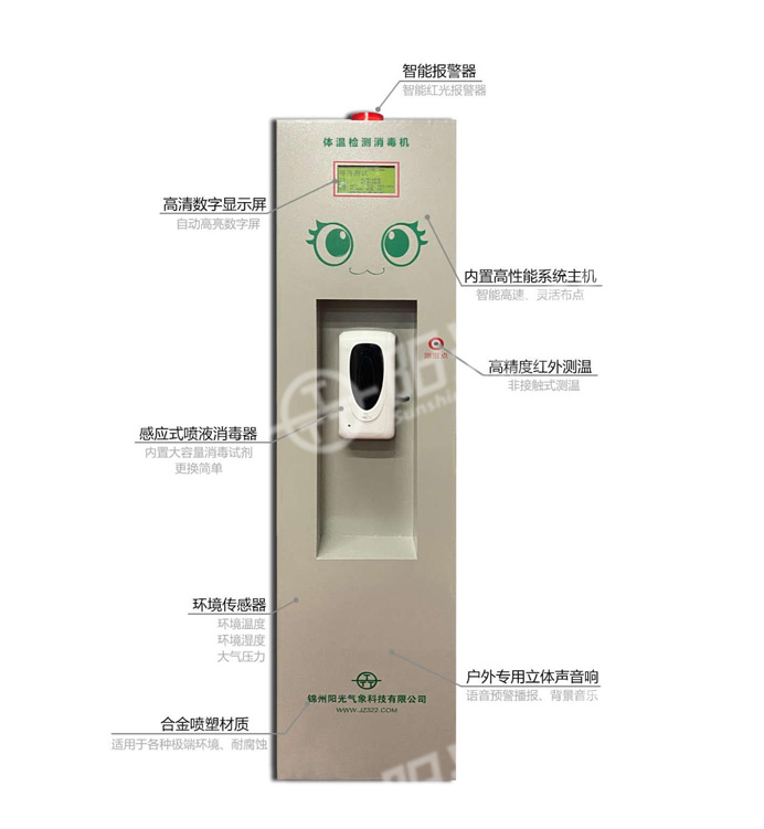 体温检测消毒机为锦州阳光气象旗下一款智能化红外体温检测、消毒一体化产品,是集环境监测、红外体温检测、体感喷雾消毒、语音报警等功能于一体的新一代体温检测消毒机。与传统产品相比更准确、快速、便捷、安全,避免因排队测温引起的交叉传播,还可有效提高工作效率。可广泛应用学校、工厂、居民社区、商场等人流量大的场所。